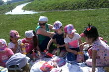 Согласно годового плана,сегодня с детьми старшей группы, был организован поход к речке Кубня. Детям было очень интересно .По дороге они наблюдали окружающую природу.Играли в разные подвижные игры.А самым кульминационным моментом для них было время трапезы.Дети угощали друг-друга всякими вкусняшками,которые принесли с собой в рюкзачках.