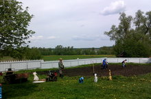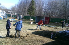 Сотрудники на участке детского сада,посадили картошку,лук,посеяли морковь,свеклу.
