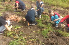 На огороде в школе сегодня убираем морковь. Получили неожиданный, хороший урожай .