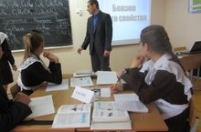 Согласно расписанию на 2 уроке Яковлев В.И. показал открытый урок по химии, составленный по сингапурской структуре в 9 классе по теме: Бензол и его свойства. Задачами данного следующие:• Образовательные: закрепить представление об ароматических углеводородах. Рассмотреть причинно – следственную связь между составом, свойствами и применением, изучить физические и химические свойства бензола, показать его токсическое действие на организм человека.• Развивающие: развить умения в написании уравнений химических реакций, излагать и доказывать свое мнение, кратко и связно излагать материал, способствовать продолжению развития устойчивого интереса к химической науке.• Воспитательные: воспитывать стремление к повышению личных знаний, развивать нестандартное мышление, показать значимость химических знаний для современного человека. -
