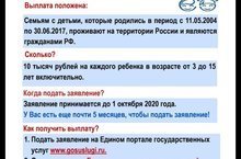 Семьи с детьми, которые родились в период с 11.05.2004 по 30.06.2017, проживают на территории России и являются гражданами РФ, могут получить выплату в 10 тысяч рублей. Просим подать заявление на сайте www.gosuslugi.ru или же в МФЦ или Пенсионном фонде.