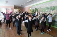 Иртәнге зарядка кысаларында мәктәп укучылары «Россия мәктәп укучылары хәрәкәте» гомумроссия иҗтимагый-дәүләт балалар һәм яшүсмерләр оешмасы гимнына бию өйрәнү белән мәшгуль.