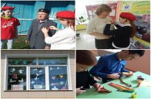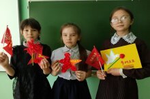 Җиңү көне уңаеннан кабул ителгән акцияләр кысаларында 9 класс укучылары класс тәрәзәсен бизәделәр, үз куллары белән Георгий тасмасы ясадылар һәм ветеран укытучыларга тараттылар.