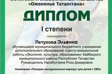 С целью патриотического воспитания подрастающего поколения и стимулирования интереса к изучению исторического и культурного наследия малой Родины, Республиканским центром внешкольной работы проводился конкурс: "Ожерелье Татарстана". Среди юнармейцев в этом конкурсе приняла участие Петухова Эвелина - отряд имени Героя Советского Союза Михаила Кузьмича Кузьмина МБОУ «Старотябердинская СОШ». Это маршрут для людей с ограниченными возможностями, по Парку Победы в районном центре. Она получила заслуженную победу. Молодец. Ждем следующих побед. Юнкоры отряда.