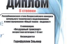 Диплом II степени Республиканского этапа Всероссийского конкурса начального технического моделирования и конструирования «Юный техник-моделист» 20.05.2020