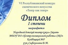 Дипломом первой степени в руках у народного театра кукол от ЦВР- «Экият». Руководитель: Сафиуллина В.М..