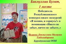Победитель Республиканского конкурса видео экскурсий «Я помню, я горжусь!» в номинации «Никто не забыт, ничто не забыто..». Бикмуллин Булат - Бурундуковская ООШ . Юнармеец отряда имени Героя Социалистического труда Рифката Калимуллович Калимуллина МБОУ «Бурундуковская ООШ» Педагог: Бикмуллина Миляуша Габдлхабировна.