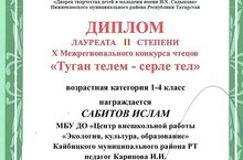 Сабитов Ислам учащийся объединения «Юные таланты» стал лауреатом 2 степени приняв участие в IX Межрегиональном конкурсе чтецов «Туган телем - серле тел».
