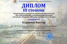 Педагог по техническому направлению Акрымов Артур Александрович со своим воспитанником Виктором Курвичевым участвовали Республиканском конкурсе по стендовому судомоделизму "Моё хобби-флотилия",посвященного празднованию в Республике Татарстан 350- летия со дня рождения Петра I и стали победителями диплома III Степени