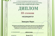 X Республиканском конкурсе Экологической социальной рекламы "Город под защитой детства" участвовал педагог дополнительного образования Валиев Марат Фагимович с воспитанником Зиннуровым Маратом в номинации "Робототехника" и удостоились диплома III Степени.