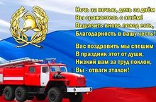 Поздравляем Вас с днём мужественных и сильных людей, чей профессиональный долг заключается в спасении и сохранении жизни и здоровья людей. Желаем Вам крепкого здоровья, волевых решений, смелых поступков. Пусть будет больше спокойных дней в Ваших трудовых буднях.