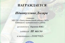 Поздравляем участницу Идиатуллину Диляру занявшую III место, в VI Республиканском заочном конкурсе экскурсивных проектов . видео экскурсий «Ожерелье Татарстана».
