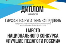 Преподаватель отделения "Фортепиано" Гирфанова Русалина Рашидовна приняла участие в национальном Всероссийском конкурсе "Лучшие педагоги России" в номинации: методические работы и разработки, название работы: "Элегия" Дж.Файзи, переложение для ансамбля балалек. Русалина Рашидовна удостоилась Диплома за 1 место. Пожелаем нашему преподавателю дальнейших творческих успехов в работе.