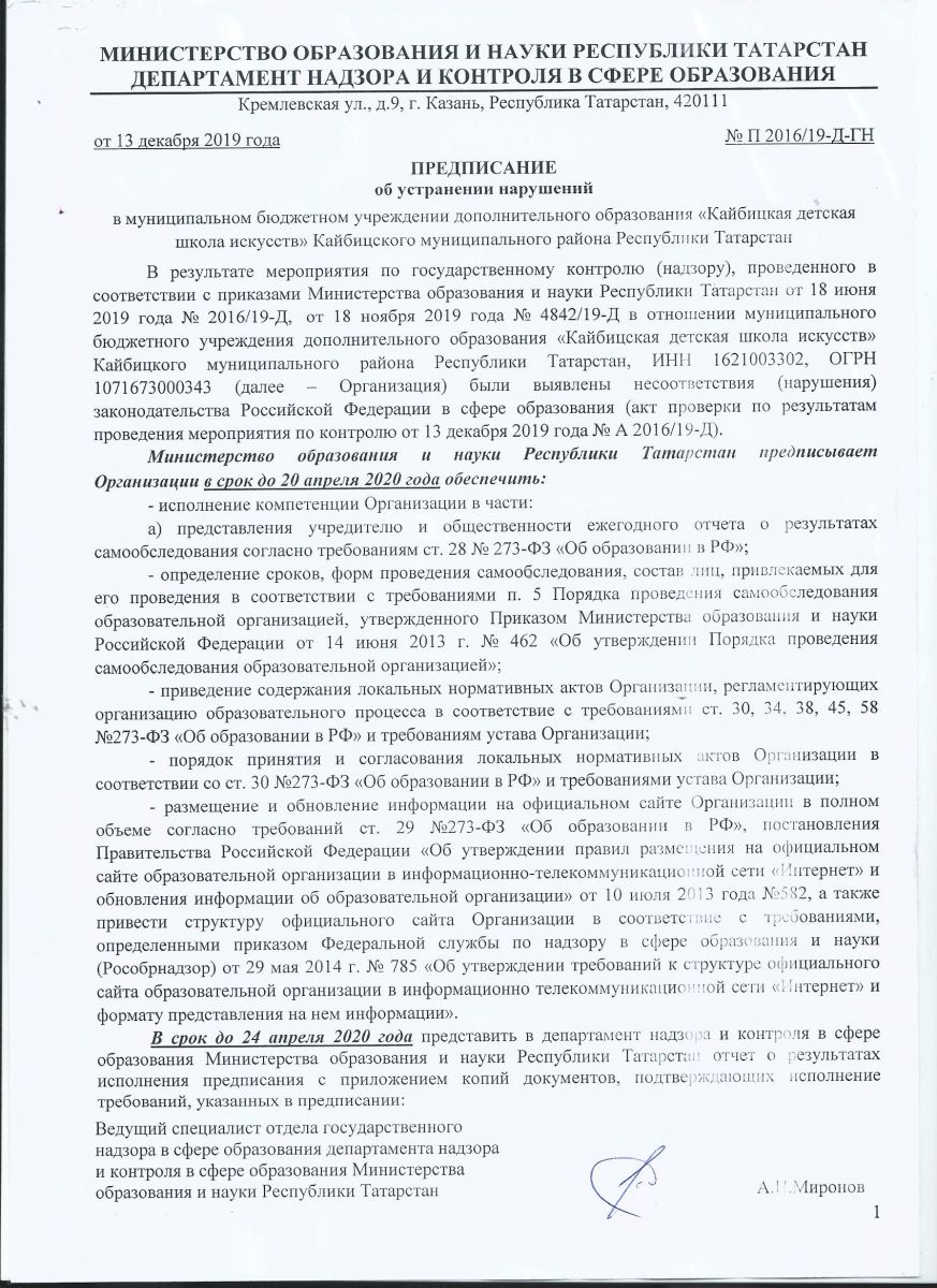 Предписание об устранении нарушений от 13.12.2019г. № П 2016/19-Д-ГН