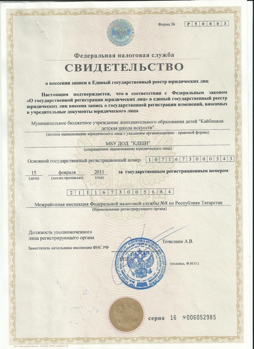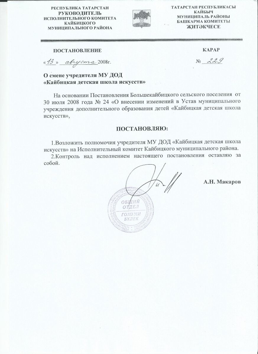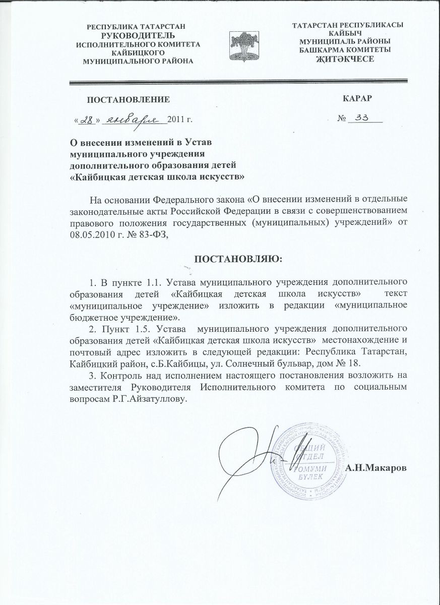 Постановление о смене учредителя МУ ДОД "Кайбицкая детская школа искусств"