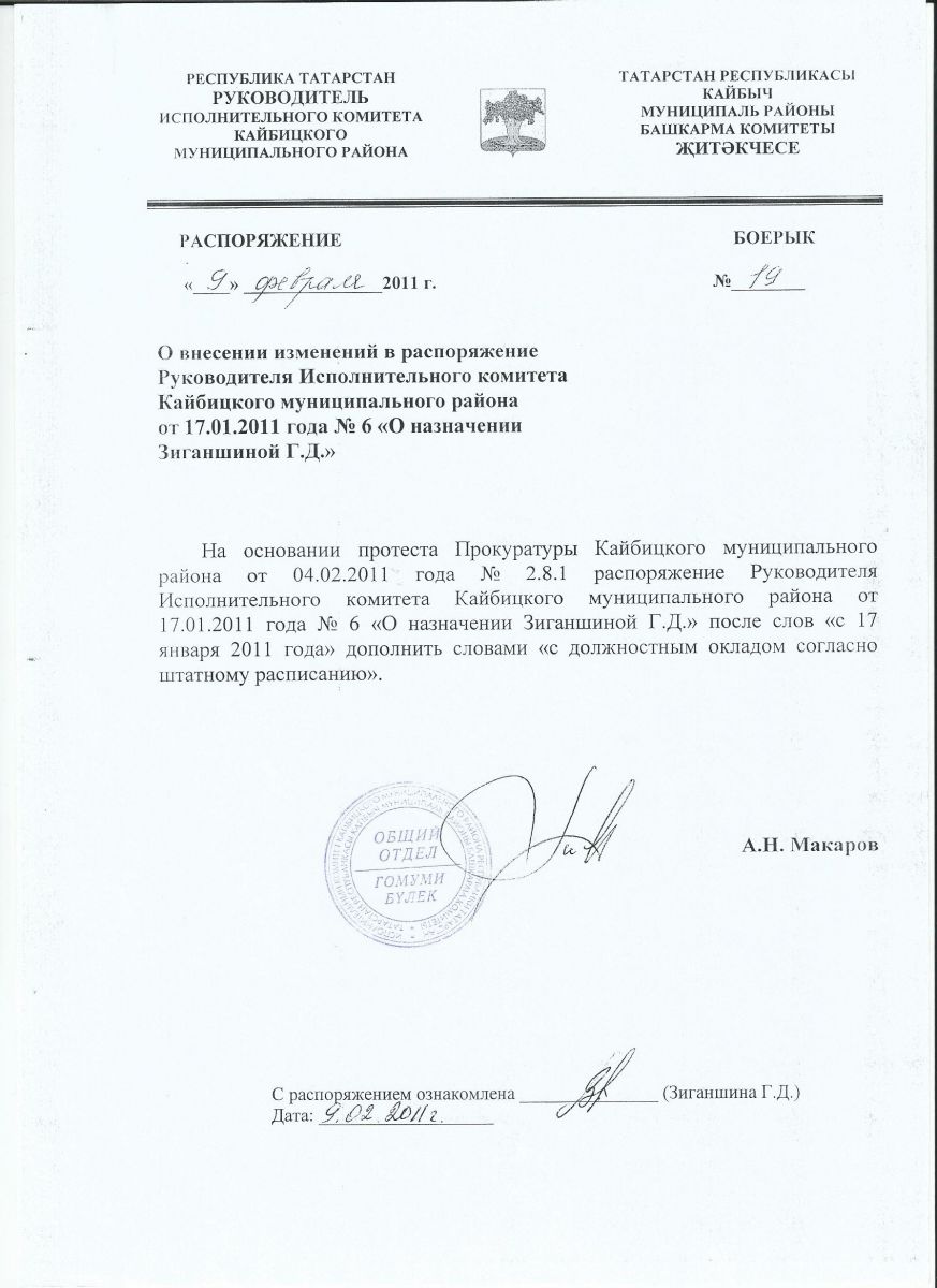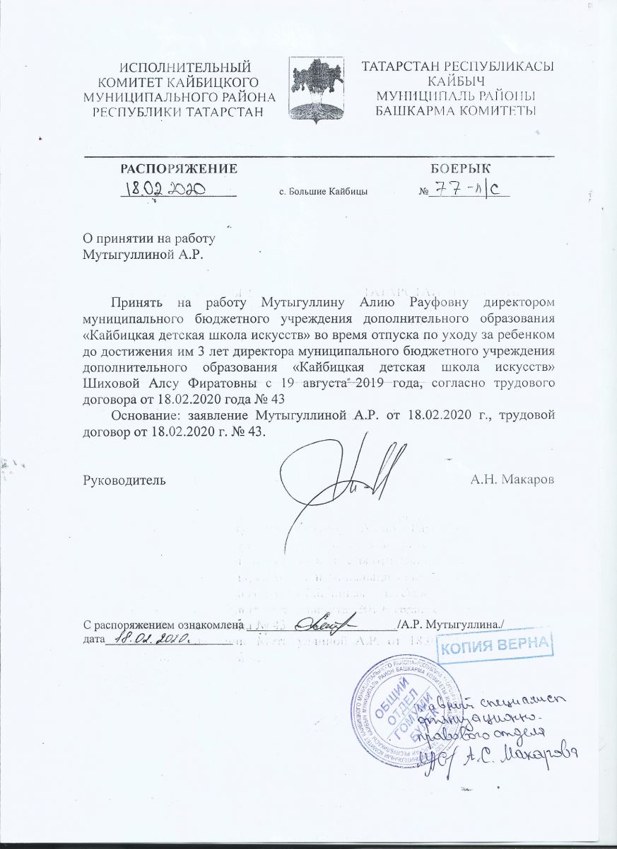 Распоряжение о принятии на работу директора Мутыгуллиной А.Р.