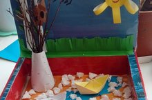 Мы с детьми сделали поделку на весеннюю тему.Поделка отличается обилием весенних явлений,духом свежести.Мы показали прилет птиц,таяние снега,кораблик для ручья,солнце,скворечник ,веточки с распускающимися почками.