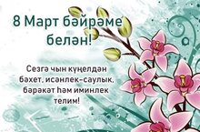 Көннең яктылыгы кояшта, күкнең бар матурлыгы йолдызларында, кешелекнең бөтен гүзәллеге хатын-кызларда. Рөхсәт итегез сезне, кешелекнең бизәге булган гүзәл затны, шушы искиткеч матур яз бәйрәме- Халыкара хатын-кызлар көне белән тәбрик итәргә. Шушы гаҗәеп гүзәл бәйрәм көнендә елмаеп баккан кояштай һәрвакыт балкып яшәгез. Күңелегездән шатлык, тәнегездән саулык-сәламәтлек, йортыгыздан иминлек-бәракәт китмәсен! Бәйрәмегез котлы булсын!