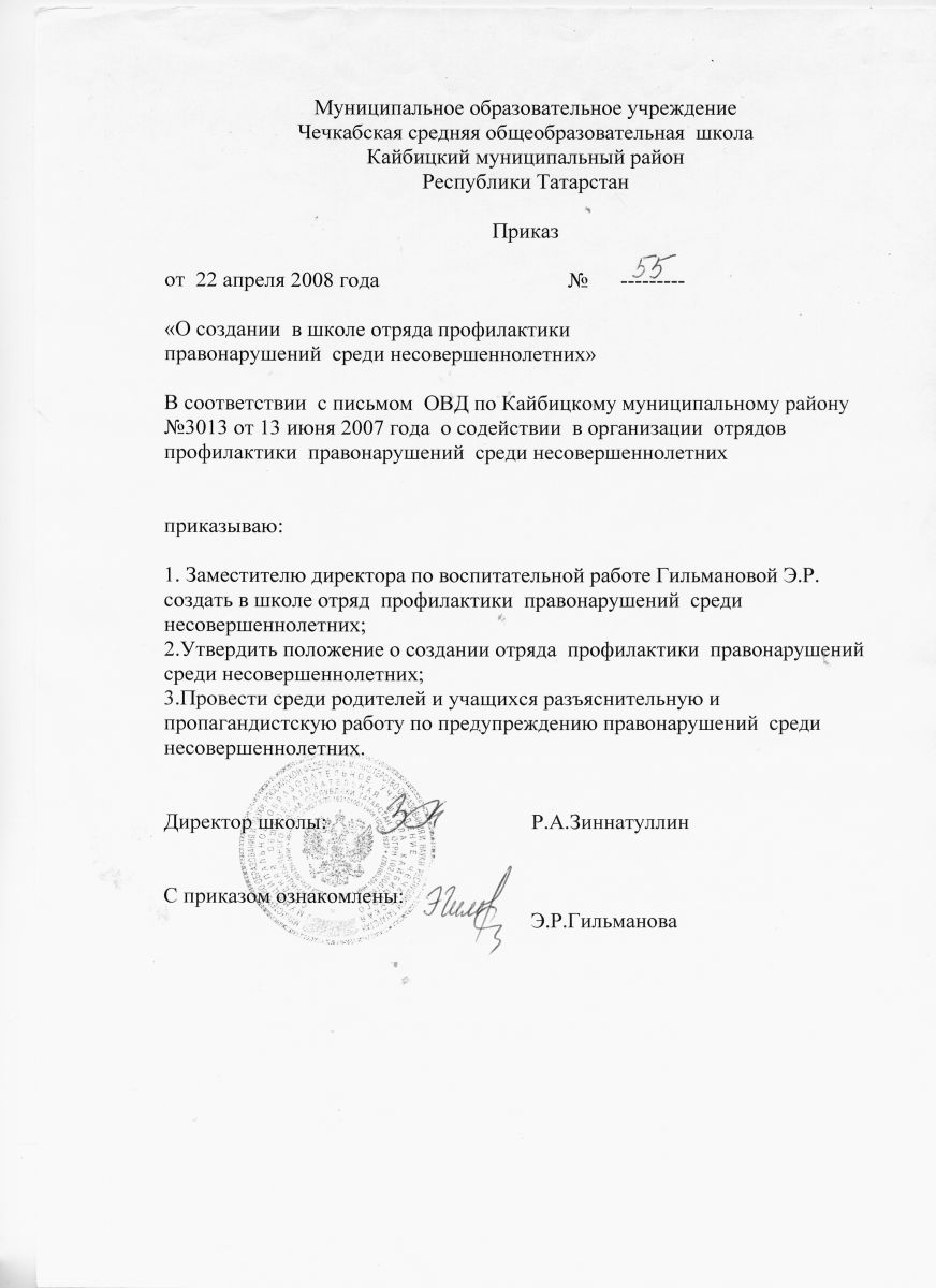 Приказ "О создании в школе отряда профилактики правонарушений среди несовершеннолетних"