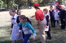 В рамках акции "Экстремизму - нет!" члены отряда "Юнармия" на большой перемене проводят игры на воздухе с учениками младших классов.