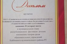 Воспитанники детского сада "Солнышко" со своими воспитателями Кармаенковой М.В., Бладцевой А.Ю. удостоились Диплома призера, заняв 2 место в муниципальном этапе Республиканского фестиваля детских юношеских театров среди образовательных учреждений Кайбицкого муниципального района Республики Татарстан..Мы поздравляем их с этой наградой.