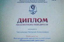 Коллекив школы и учащиеся рады поздравить директора школы, учителя русского языка и литературы, Челнокову Н.А. с заслуженной победой! В Международной просветительской акции "Пушкинский диктант" она стала абсолютным победителем! Мы желаем ей дальнейших творческих успехов!