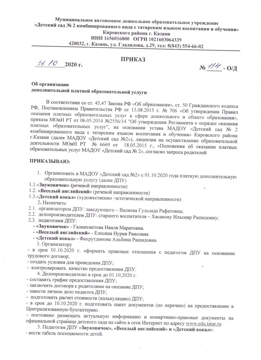 Приказ № 114 О/Д "Об организации дополнительной образовательной услуги"