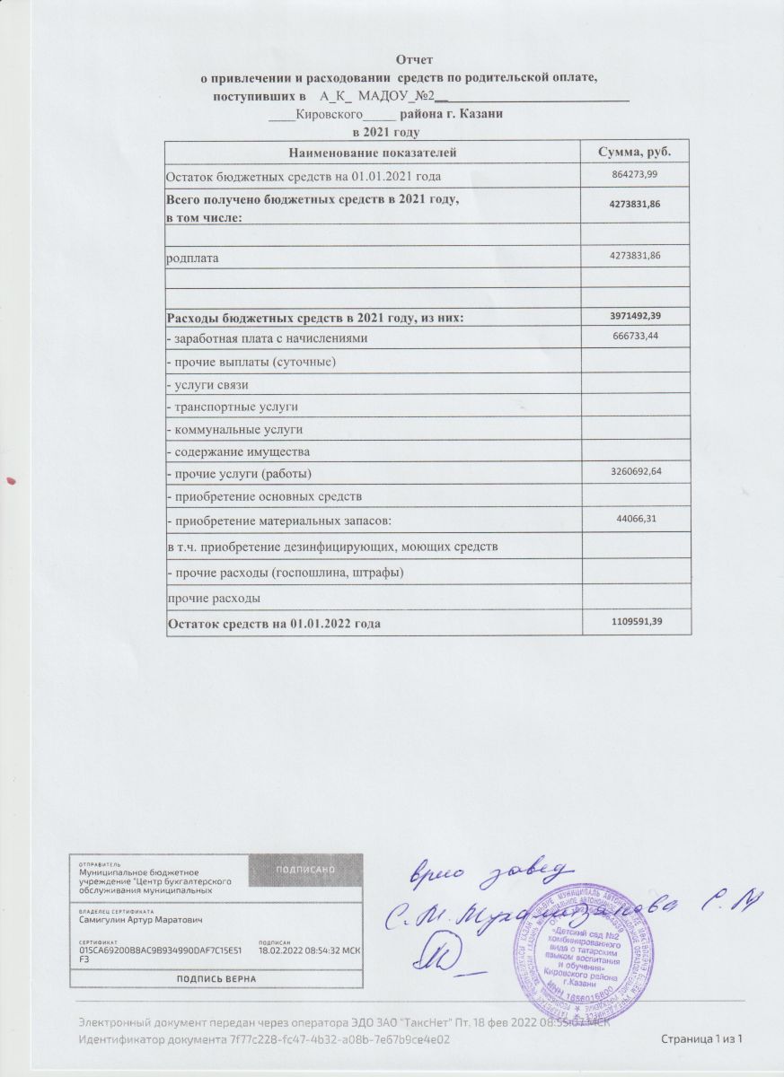 Отчёт о привлечении и расходовании средств по родительской оплате поступивших в 2021 году