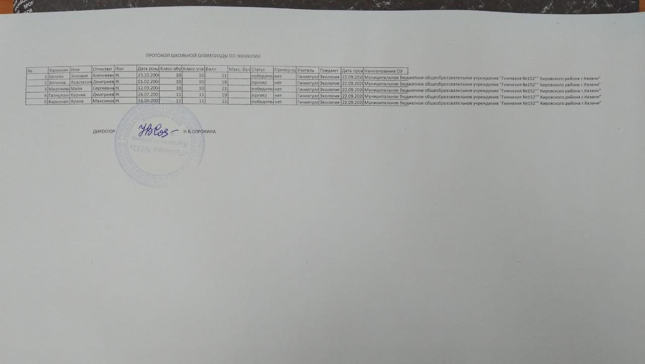 Протокол школьной олимпиады по биологии
