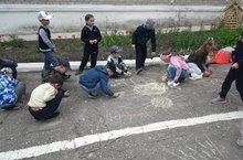 Лето! Солнце! Ребята мелками рисовали солнечное лето на асфальте.