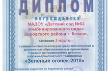 Поздравляем наш коллектив нашего детского сада с 3 местом! в районном этапе городского конкурса среди воспитателей и дошкольных образовательных учреждений г. Казани по профилактике детского дорожно-транспортного травматизма "Зелёный огонёк-2018". Молодцы! Так держать!