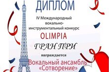 Поздравляем победителей IV Международного вокально - инструментального конкурса "Olimpia" Вокальный ансамбль "СОТВОРЕНИЕ" - ГРАН-ПРИ! Руководитель Низамова Маргарита Вахитовна. Камерный ансамбль преподавателей - Лауреат 1 степени. Руководитель Христофорова Светлана Анатольевна, концертмейстер Соколовская Марина Борисовна. Желаем новых свершений и побед!
