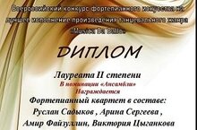 Поздравляем Лауреатов II степени Всероссийского конкурса фортепианного искусства на лучшее исполнение произведения танцевального жанра "Musika Da Ballo " Руслана Садыкова, Арину Сергееву, Викторию Цыганкову, Амира Файзуллина (номинация "Ансамбли"), преподаватели Лариса Ибрагимовна Гайсина, Фануз Чулпанович Гайсин