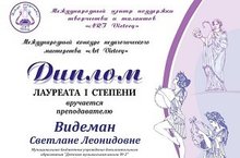 Поздравляем победителя Международного конкурса педагогического мастерства "Art Victory" преподавателя ВИДЕМАН СВЕТЛАНУ ЛЕОНИДОВНУ.