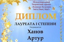 Поздравляем победителя Международного творческого проекта "Конкурс Будущих Звёзд Start, Star!" АРТУР ХАНОВ - Лауреат 1