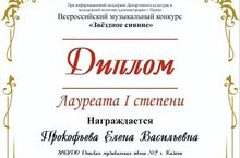 ПОЗДРАВЛЯЕМ ПРОКОФЬЕВУ ЕЛЕНУ ВАСИЛЬЕВНУ ПОБЕДИТЕЛЯ ВСЕРОССИЙСКОГО МУЗЫКАЛЬНОГО КОНКУРСА "ЗВЁЗДНОЕ СИЯНИЕ" В НОМИНАЦИИ МЕТОДИЧЕСКАЯ РАБОТА. ЖЕЛАЕМ НОВЫХ ДОСТИЖЕНИЙ И ПОБЕД!!!