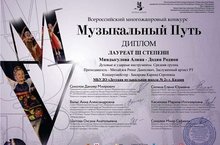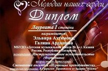 IV Всероссийском конкурсе-фестивале творчества и искусства "" Мелодии наших сердец" в номинации "Инструментальное исполнительство" (фортепиано). -
