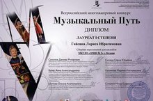 Преподаватель Лариса Ибрагимовна Гайсина стала победителем во Всероссийском многожанровом конкурсе "Музыкальный путь" (номинация "Педагогический триумф", направление "Переложения"). В качестве конкурсной работы Лариса Ибрагимовна представила сборник авторских переложений для фортепиано (в 4 руки, для 2-х фортепиано в 4 и 8 рук) и для фортепиано и виолончели.