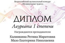 ПОЗДРАВЛЯЕМ КАЛИНКИНУ РЕГИНУ МАРАТОВНУ И МАЗО ЕКАТЕРИНУ НИКОЛАЕВНУ С ПОБЕДОЙ В ВСЕРОССИЙСКОМ МУЗЫКАЛЬНОМ КОНКУРСЕ "МУЗЫКАЛЬНЫЕ ЧУДЕСА". ЖЕЛАЕМ НОВЫХ СВЕРШЕНИЙ.