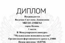 Поздравляем Видеман Светлану Леонидовну, занявшую 1 место в Международном конкурсе "Музыкальное исполнительство" 25.04.2022