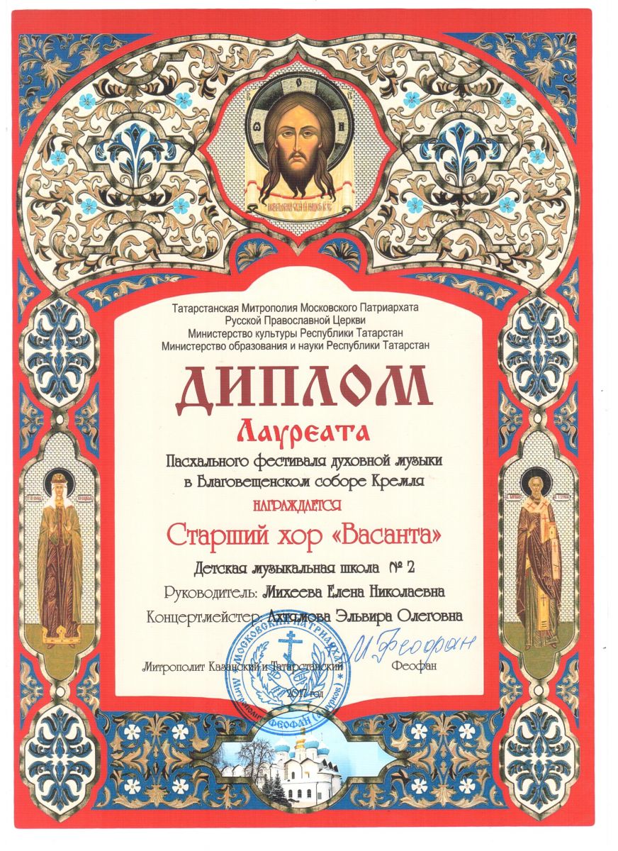 Опубликовано: 25.04.201723 апреля 2017 года состоялось выступление старшего хора «Васанта» на Пасхальном фестивале духовной музыки в Благовещенском соборе Казанского кремля. Перед зрителями выступили детские хоры музыкальных и общеобразовательных школ города. Мероприятие было организовано Татарстанской митрополией, управлением культуры и управлением образования Исполнительного комитета города Казани.