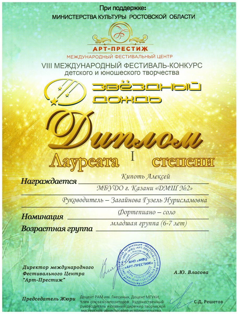 Кипоть Алексея, с присвоением звания ЛАУРЕАТ I СТЕПЕНИ Класс преподавателя Г.Н.Загайновой