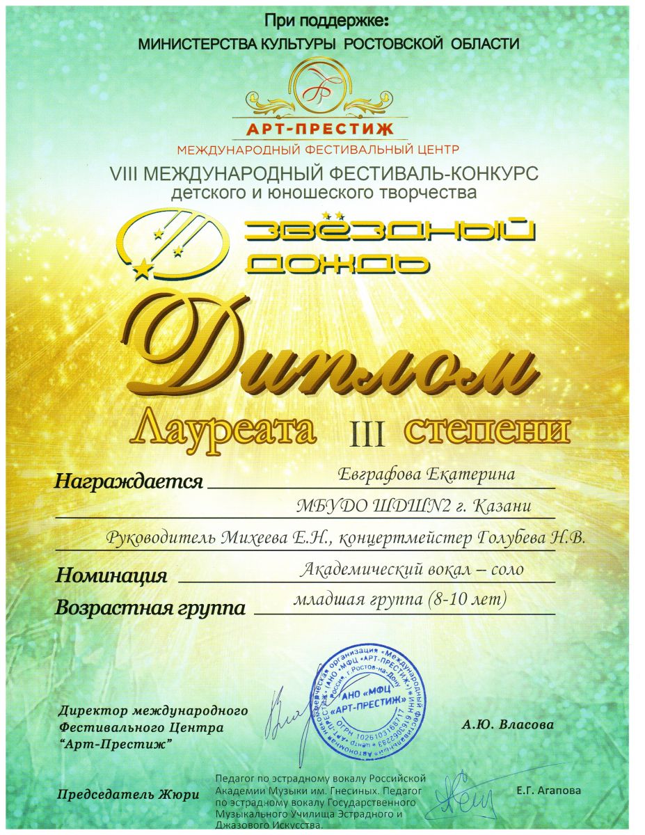 Евграфову Екатерину, с присвоением звания ЛАУРЕАТ III СТЕПЕНИ Класс преподавателя Е.Н.Михеевой, концертмейстер Н.В.Голубева