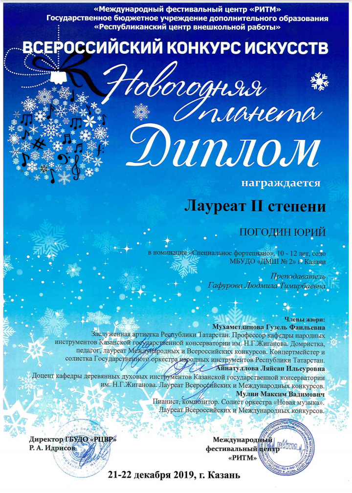 ПОГОДИНА ЮРИЯ (фортепиано) с присвоением звания ЛАУРЕАТ II СТЕПЕНИ