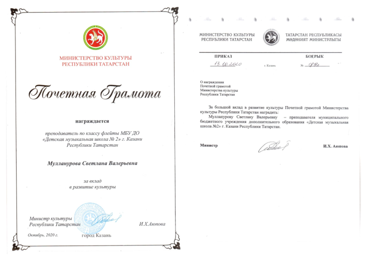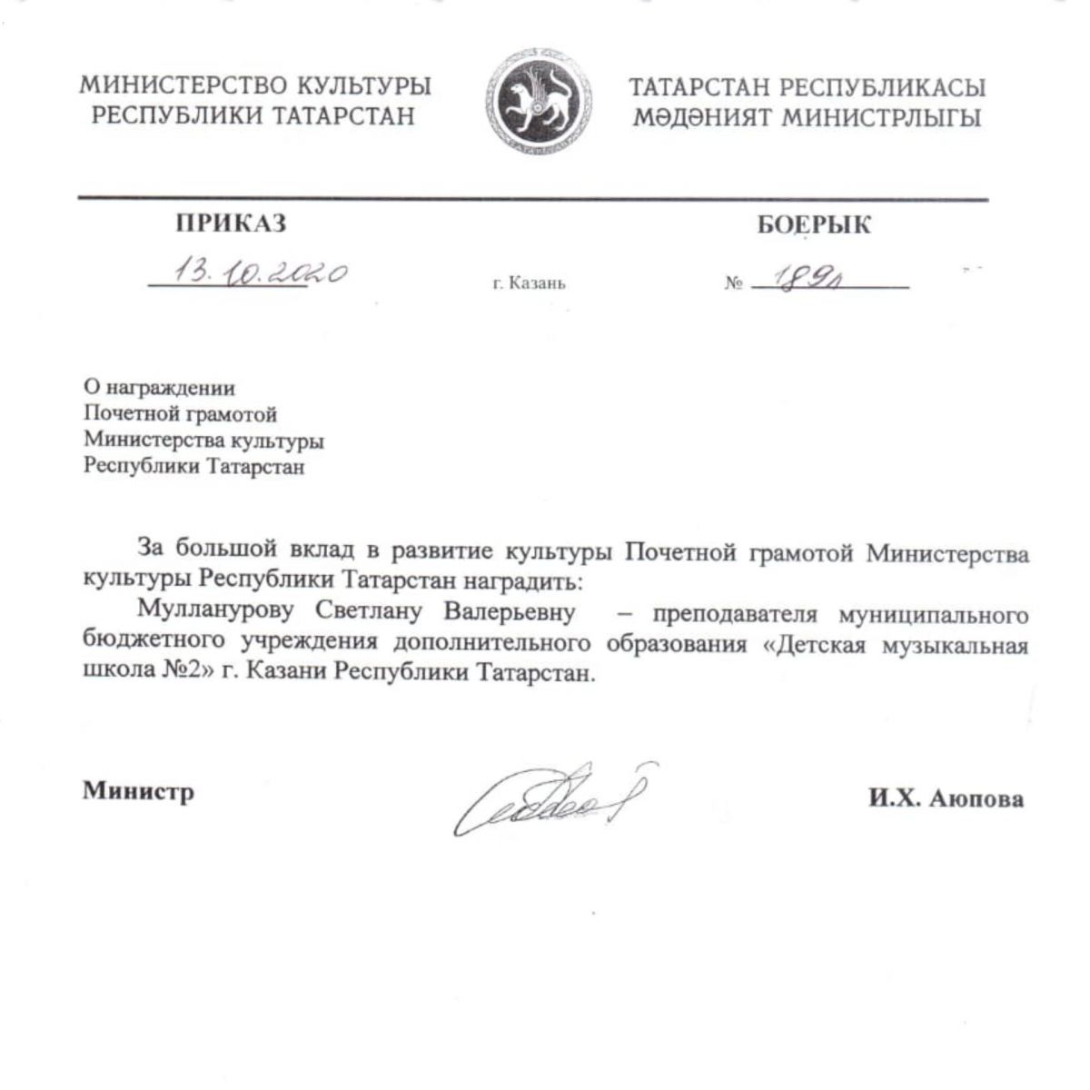 Опубликовано: 15.10.2020Поздравляем Светлану Валерьевну Мулланурову - преподавателя нашей школы по классу флейты, с награждением Почётной грамотой Министерства культуры Республики Татарстан за большой вклад в развитие культуры!
