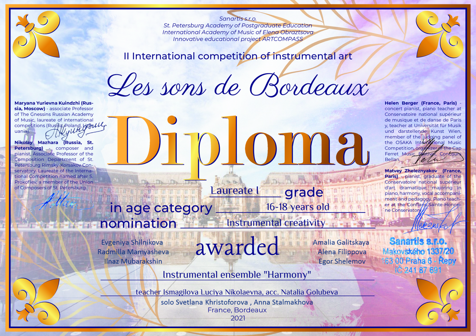 Поздравляем Лауреатов 1 степени II Международного конкурса инструментального творчества "LES SONS DE BORDEAUX" (Бордо, Франция)!