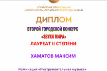 Хаматов Максим стал Лауреатом II степени Второго городского конкурса "Звуки мира" в номинации «Инструментальная музыка».