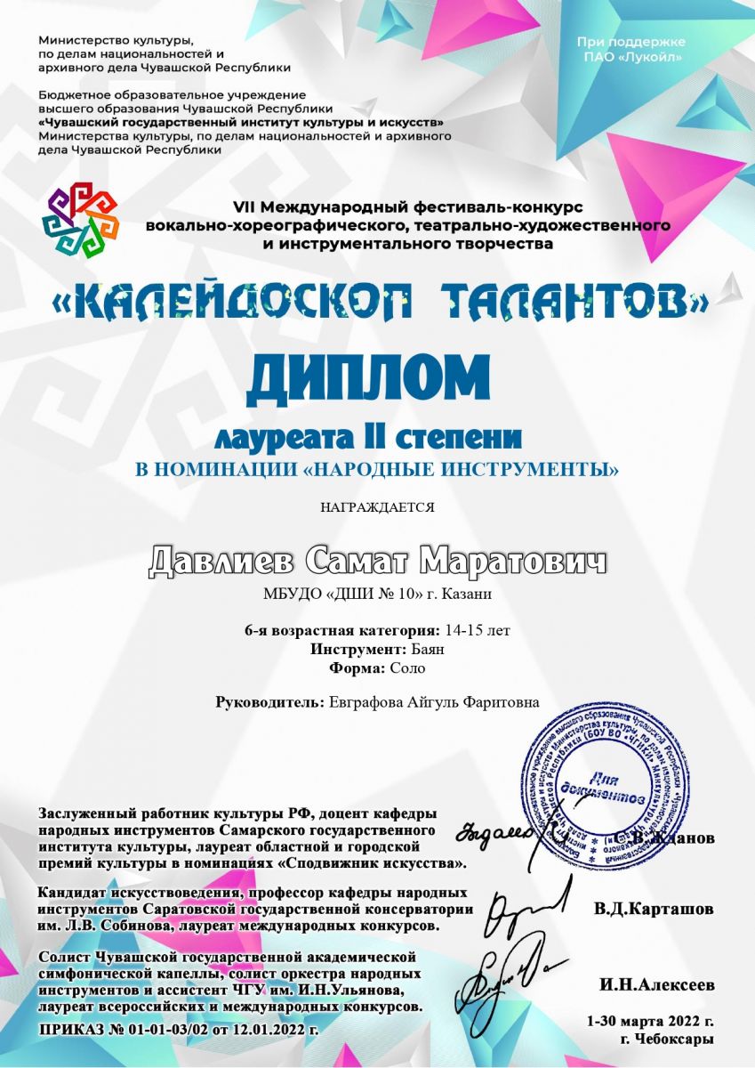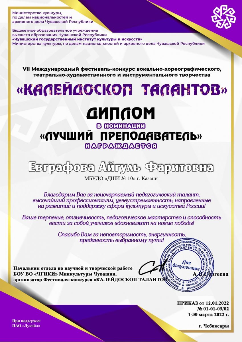 В марте 2022 года в г. Чебоксары прошел VII Международный фестиваль-конкурс вокально-хореографического, театрально-художественного и инструментального творчества "Калейдоскоп талантов". МБУДО "Детская школа искусств №10" г. Казани на данном конкурсе представил учащийся народного отделения Давлиев Самат (класс преподавателя Евграфовой Айгуль Фаритовны). В номинации "Народные инструменты" Самат стал лауреатом II степени. Поздравляем Айгуль Фаритовну и Самата с успехами на конкурсе и желаем дальнейших творческих успехов. Администрация школы выражает благодарность Евграфовой А.Ф. за подготовку учащегося к конкурсу.