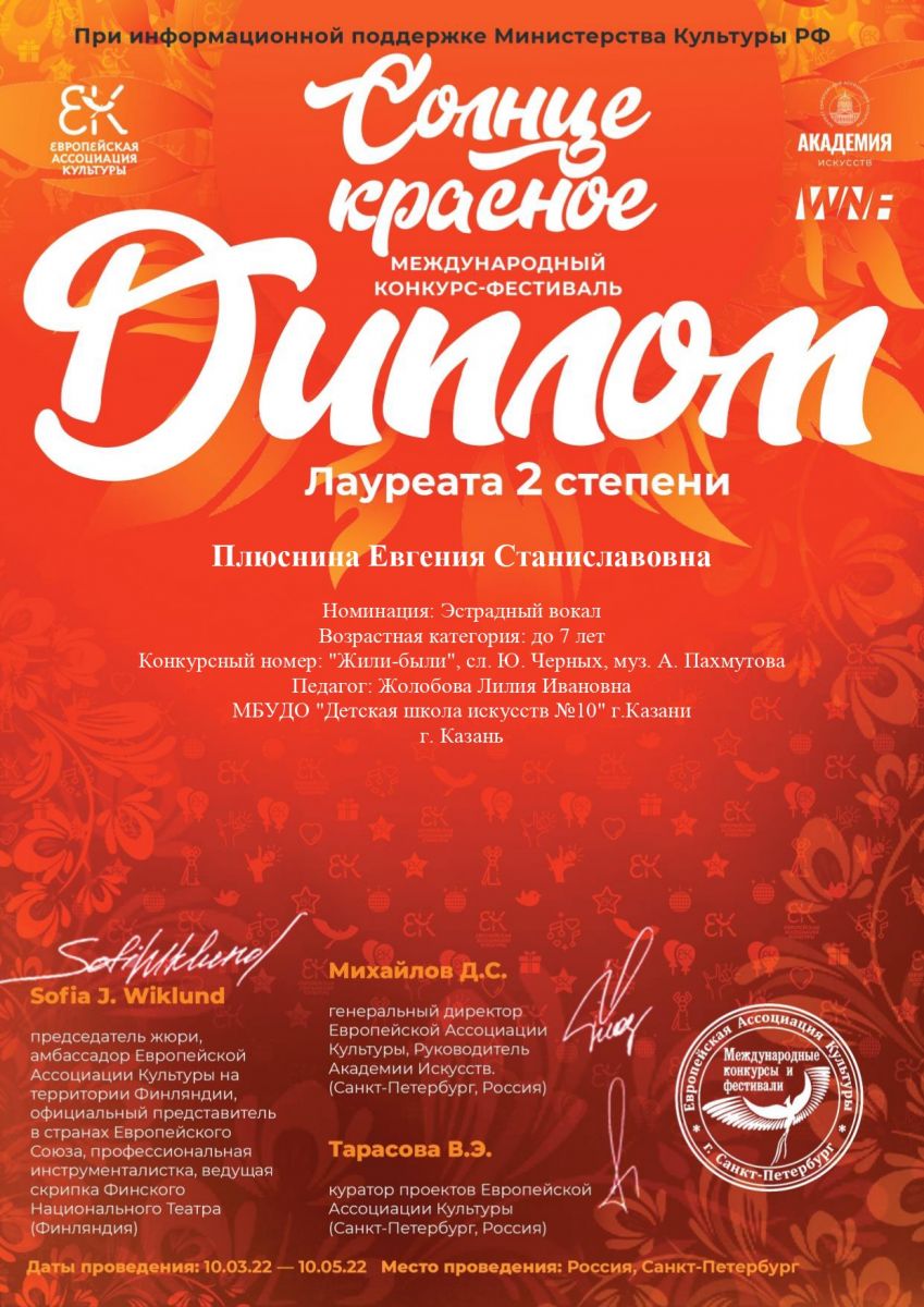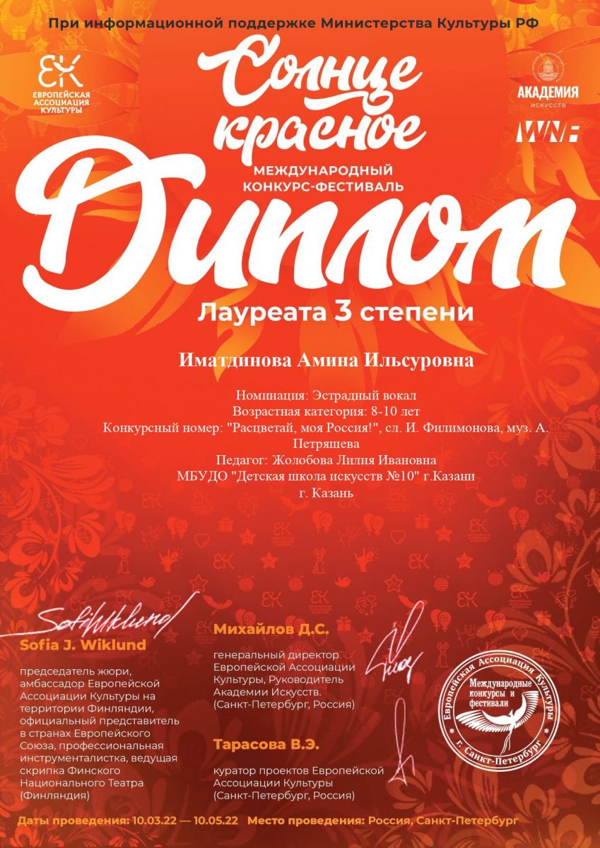 В марте 2022 года в г. Санкт-Петербург прошёл Международный конкурс-фестиваль "Солнце красное" при информационной поддержке Министрества культуры РФ. МБУДО "Детская школа искусств №10" г. Казани на конкурсе с успехом представили учащиеся хорового отделения класса преподавателя Жолобовой Лилии Ивановны: Ибатуллина Ясмин и Плюснина Евгения удостоились диплома лауреата 2 степени, а Иматдинова Амина и Быков Александр стали лауреатами 3 степени. Поздравляем учащихся и преподавателя, а также желаем дальнейших творческих успехов. Администрация школы выражает благодарность преподавателю Жолобовой Л.И. за подготовку учащихся к конкурсу.