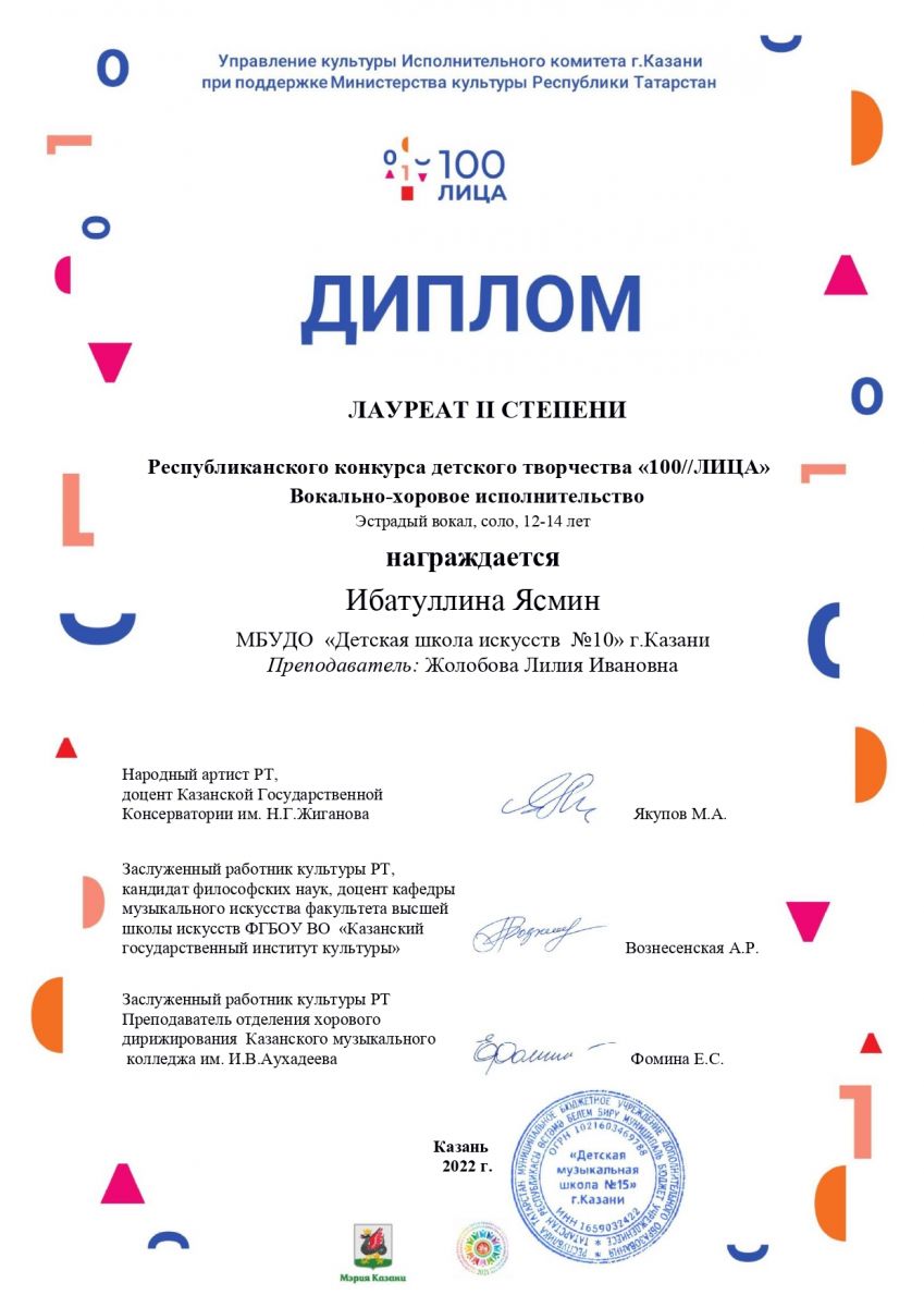 26 марта 2022 года в "Детской музыкальной школе №9" города Казани состоялся Республиканский конкурс детского творчества "100//лица". На конкурсе МБУДО "Детская школа искусств №10" г. Казани представила учащаяся хорового отделения Ибатуллина Ясмин (класс преподавателя Жолобовой Л.И.) и стала лауреатом II степени. Поздравляем Ясмин и преподавателя Жолобову Лилию Ивановну с отличными результатами конкурса и желаем новых побед! Администрация школы выражает благодарность Жолобовой Л.И. за труд.